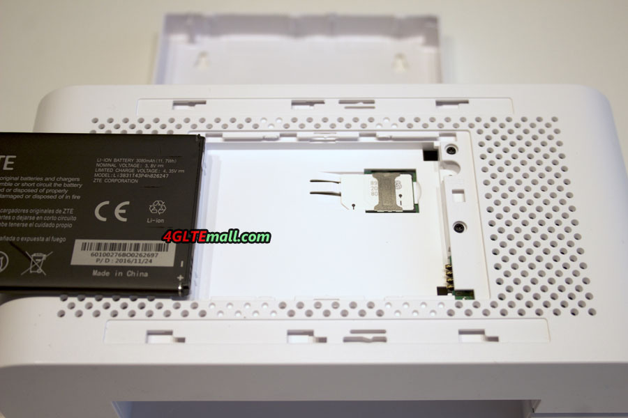Regarding the power supply, as you can see, this is a 12 volt source for 1.5 amps, which makes the ZTE MF287 3Neo router can work in a vehicle. What’s more, unlike other LTE category 6 router such as Huawei E5175, this router features an internal removable battery. This 3,080 mAh Li-ion battery allows the router to run independently for up to 5 hours of operation. So user can take the 3NEO Router on the go for outdoor activities.